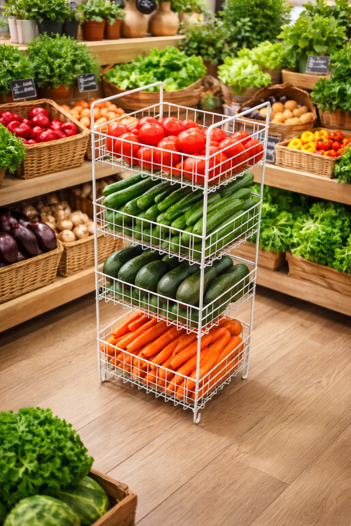Praktikus és helytakarékos megoldás a konyhában, kamrában vagy akár üzletekben is! A 4 részes zöldséges kosár ideális zöldségek, gyümölcsök, hagyma, burgonya vagy egyéb élelmiszerek szellős és átlátható tárolására. A rácsos kialakítás biztosítja a megfelelő levegőáramlást, így segít frissen tartani a tárolt terményeket.