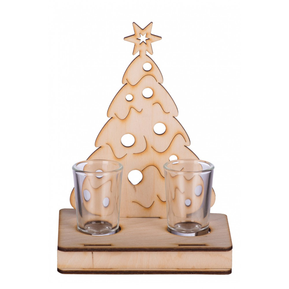 A fenyőfa sziluettű fa italszett látványos és praktikus kiegészítő az ünnepi időszakban. Az állvány elején kialakított kis tartó biztonságosan elhelyezi a két darab, üvegből készült röviditalos poharat – így a szett egyszerre dekoratív és használható. Ideális karácsonyi asztaldísznek, vendégváráshoz, vagy ízléses ajándéknak pálinkához, likőrhöz, egyéb röviditalokhoz.