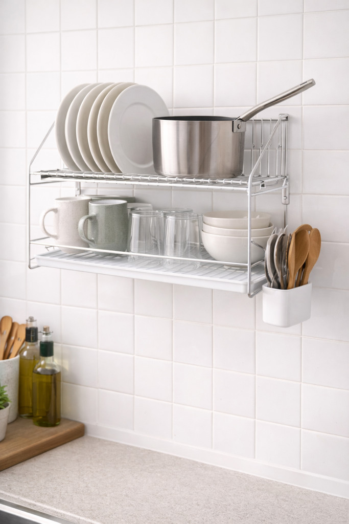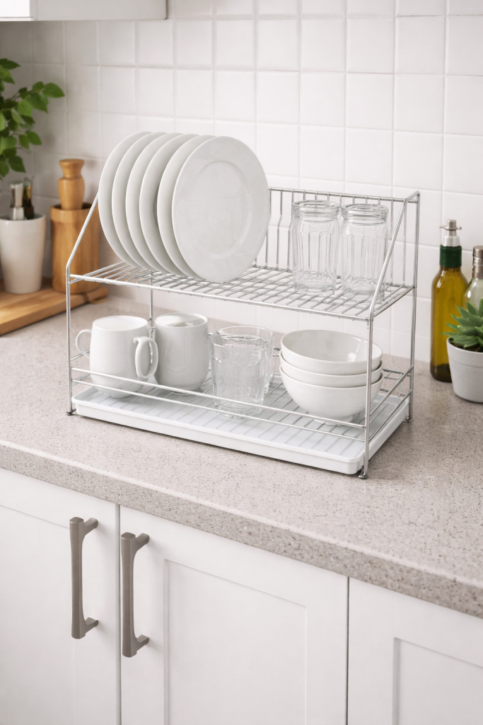 Fém Emeletes Edényszárító Műanyag Fehér Tálcával 40x42x23 cm