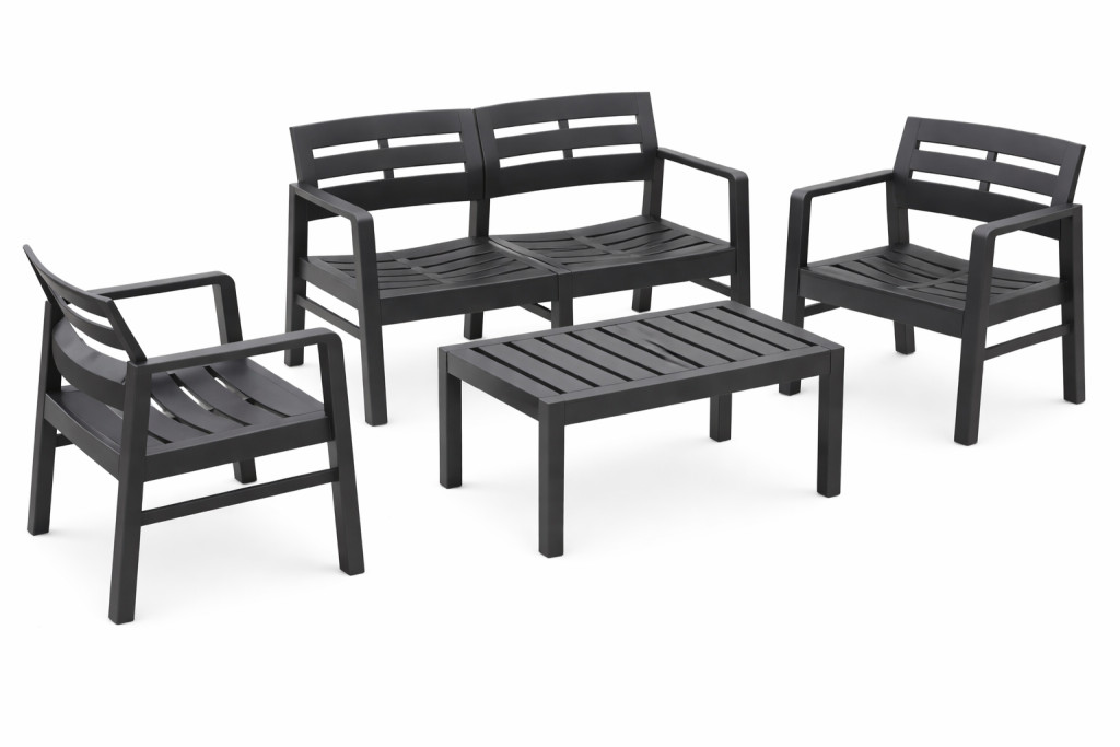 Modern, antracit színű kerti bútor szett, amely 2 db karfás fotelből, 1 db kétszemélyes kanapéból és 1 db kis asztalból áll. Ideális választás kültéri pihenéshez, beszélgetésekhez és kényelmes mindennapi használatra.