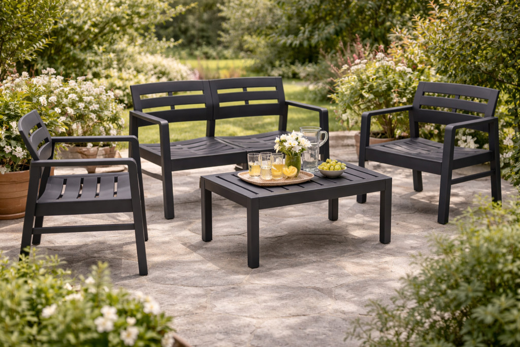 A garnitúra 1 db kétszemélyes kanapéból, 2 db karfás fotelből és 1 db kis asztalból áll, így ideális megoldást nyújt családi beszélgetésekhez, kávézáshoz vagy baráti összejövetelekhez. Kényelmes elrendezése révén kisebb és nagyobb teraszokon is jól használható. A műanyag kivitel előnye, hogy könnyen tisztítható, egyszerűen karbantartható és praktikus a mindennapi használat során.