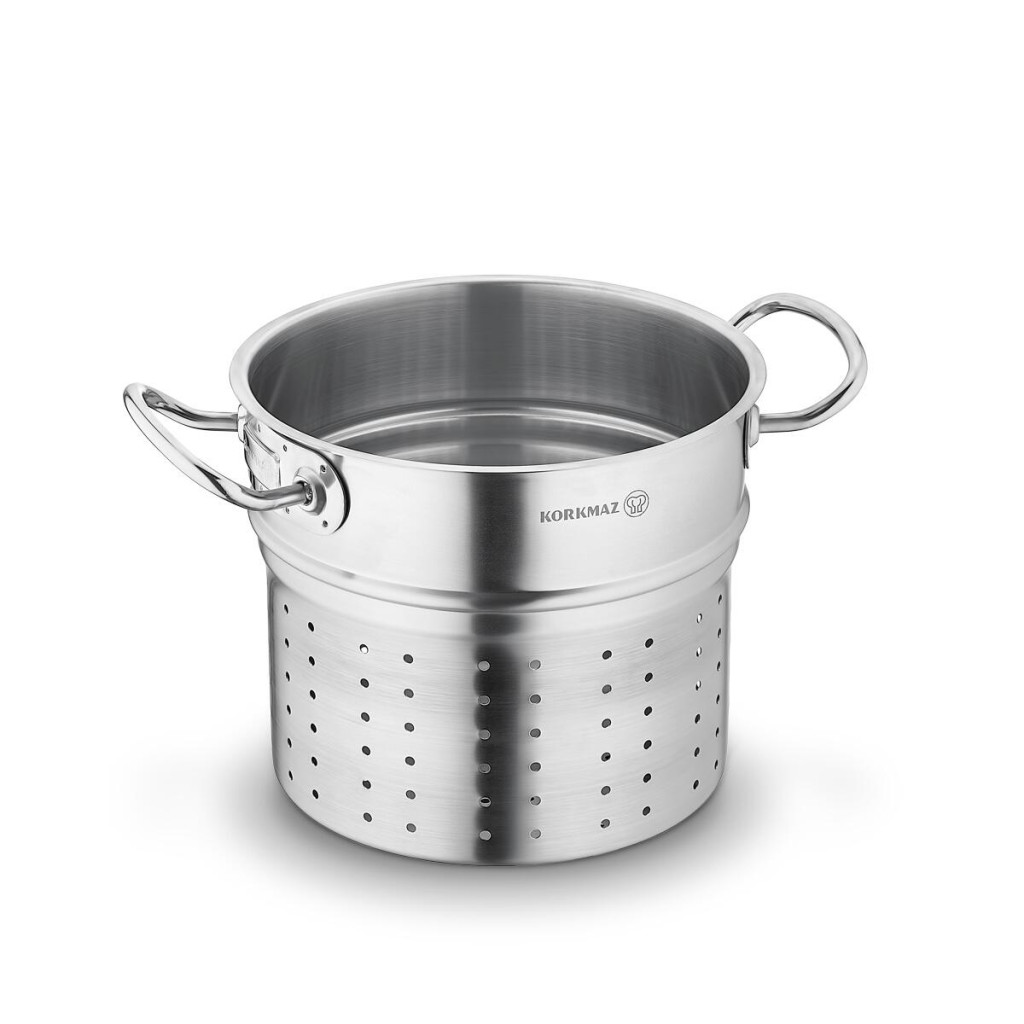 A Korkmaz Proline tésztafőző ideális tészták, ravioli és főtt ételek gyors és kényelmes elkészítéséhez. Speciális kialakítása megkönnyíti az ételek leszűrését, míg rozsdamentes acél anyaga tartósságot és higiénikus használatot biztosít.