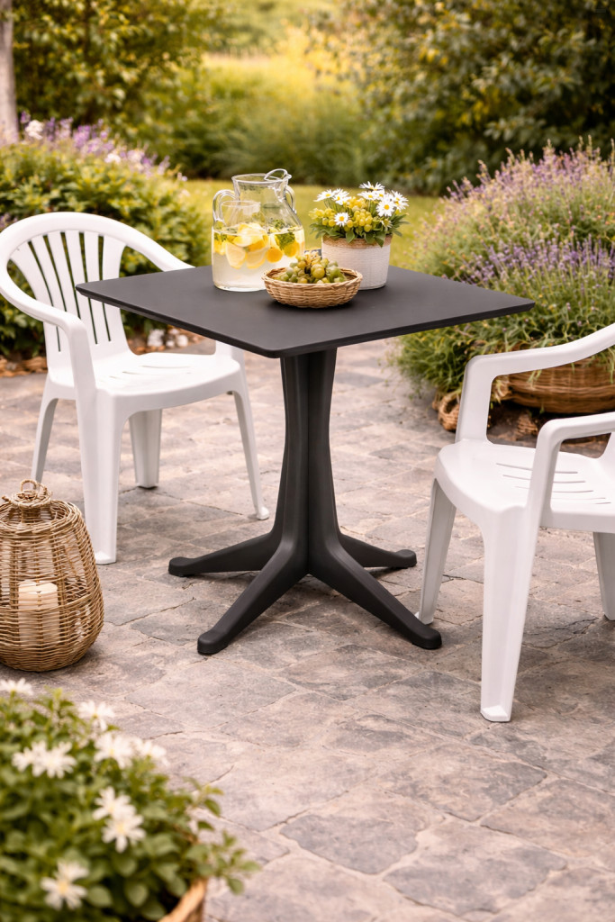 Polipropilén szerkezetének köszönhetően az asztal könnyen tisztítható, praktikus és jól használható a mindennapokban. Stabil kialakítása révén megbízható választás kültéri környezetben is, miközben letisztult formája esztétikusan egészíti ki a terasz vagy a kert berendezését.