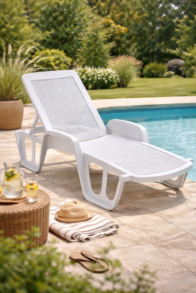 A Pool napozóágy ideális választás mindazok számára, akik kényelmes és tartós kültéri pihenőbútort keresnek. Fehér, műrattan hatású megjelenése elegáns és letisztult, így tökéletesen illeszkedik kertbe, teraszra vagy medence mellé. A több pozícióban állítható háttámla lehetővé teszi, hogy mindig az Ön számára legkényelmesebb testhelyzetben pihenjen, napozzon vagy olvasson.