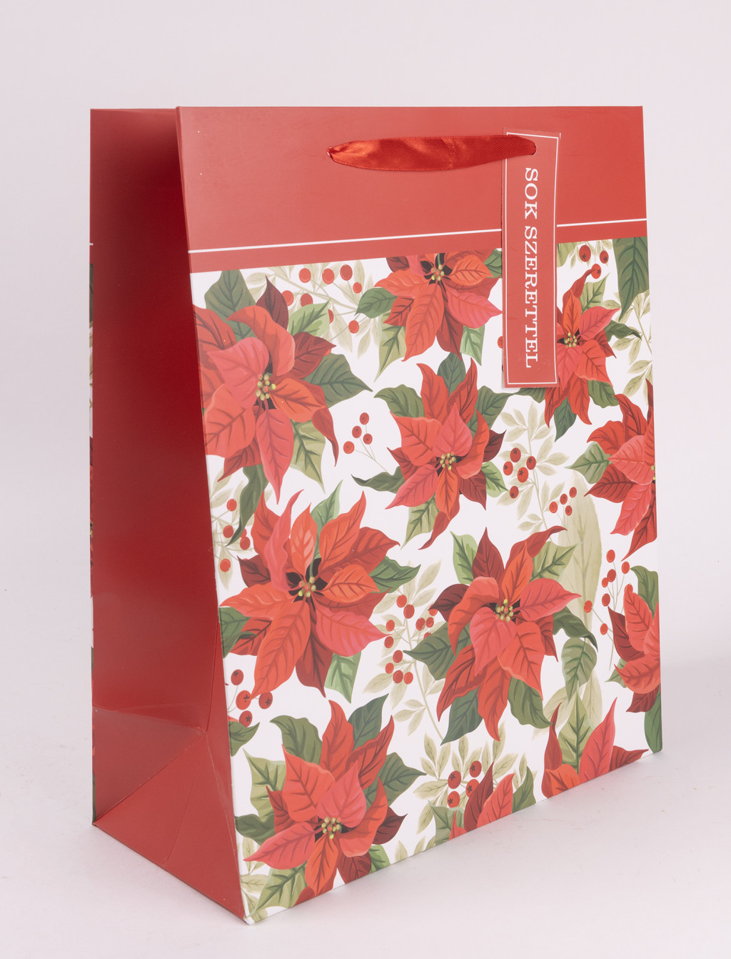 Ajándéktasak piros mikulásvirág mintával 18x23 cm 370409