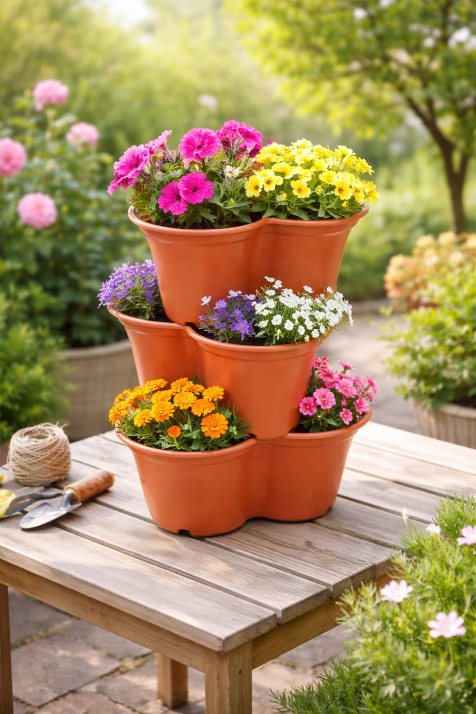 Modern és praktikus megoldás, amellyel kis helyen is látványos, többszintes virágkompozíció alakítható ki.