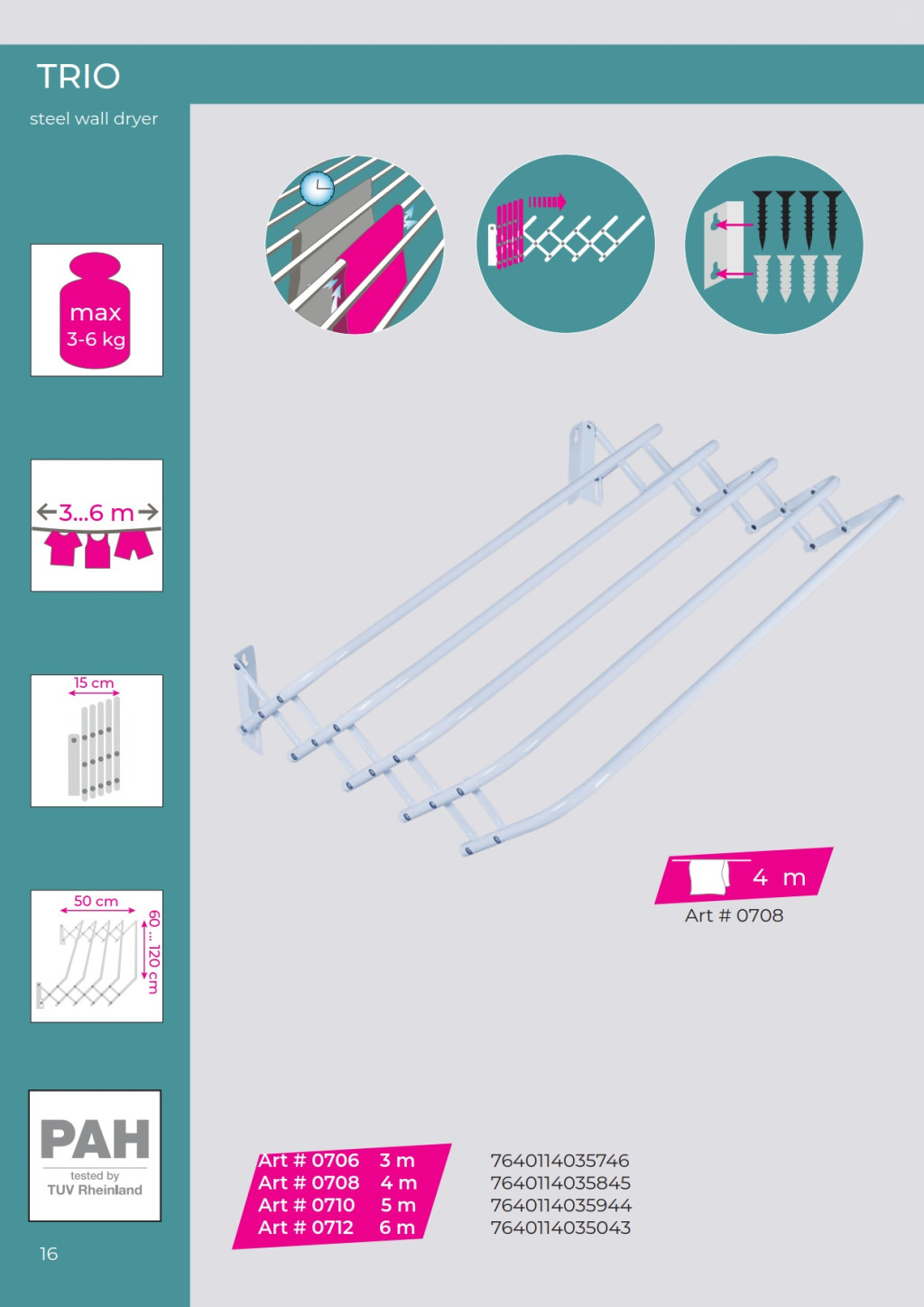 A trió harmonika kialakítású, falra szerelhető ruhaszárító praktikus és helytakarékos megoldás kisebb fürdőszobákba, erkélyekre vagy mosókonyhákba. Összecsukható kialakításának köszönhetően használaton kívül minimális helyet foglal, használatkor pedig könnyedén kihúzható és meghosszabbítható.