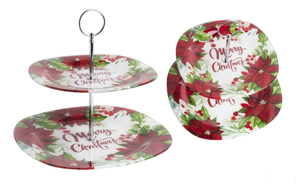 Karácsonyi 2 emeletes üveg sütikínáló, mikulás virág mintával – 20 + 25 cm 102004
