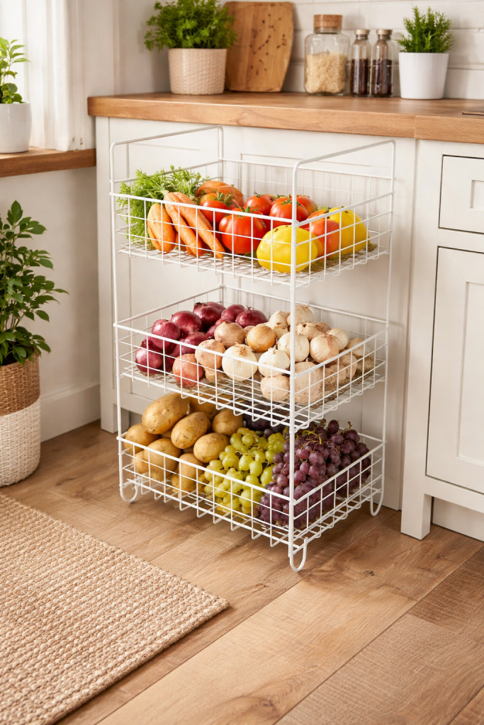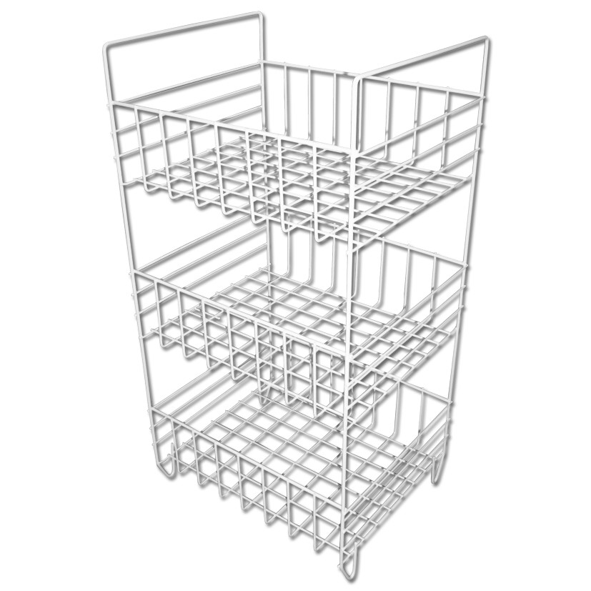 A 3 részes zöldséges kosár ideális megoldás a konyhában vagy kamrában történő rendszerezett tároláshoz. A három különálló, jól szellőző fémkosár lehetővé teszi a zöldségek és gyümölcsök átlátható, higiénikus elhelyezését. Kompakt méretének köszönhetően kisebb helyeken is elfér, miközben nagy tárolókapacitást biztosít.